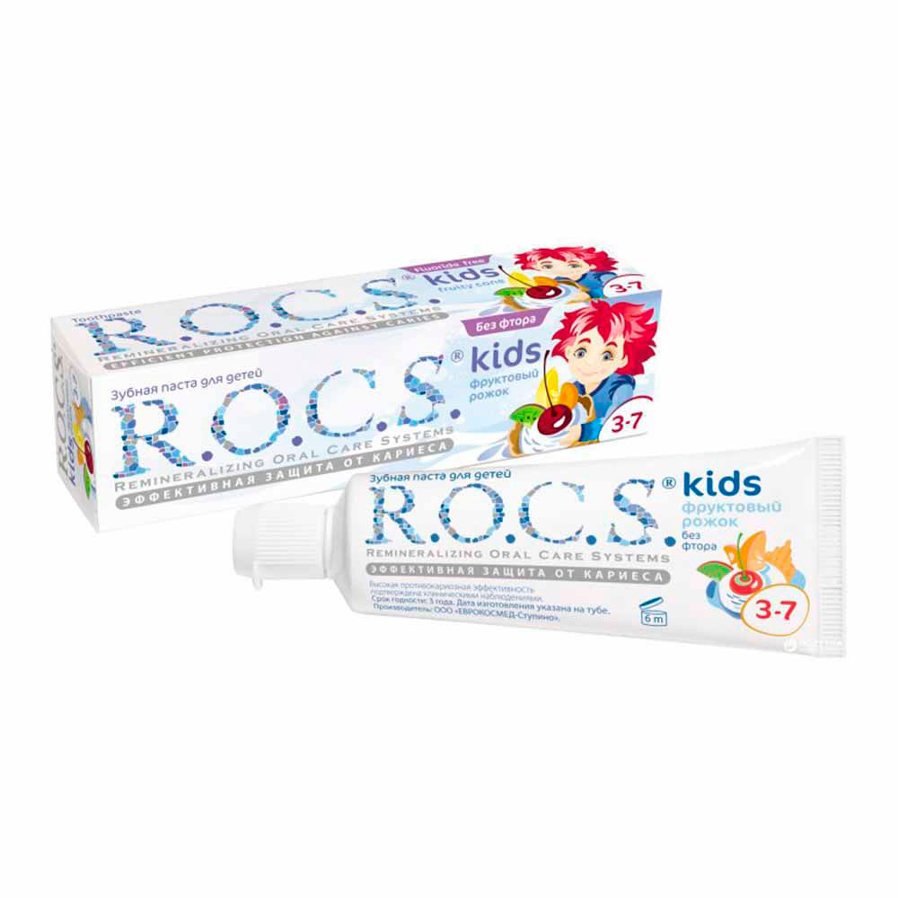 Зубная паста R.O.C.S. Kids Фруктовый рожок является эффективным средством защиты от кариеса для детей от 3 до 7 лет, не содержащим фтор. Разработана при участии стоматологов с учетом возрастных особенностей ребенка. Фруктовое мороженное — очень привлекательный для ребёнка вкус. Может быть он станет самым любимым. Стоматологи особо рекомендуют использовать зубную пасту без фтора в случаях, когда имеется риск избыточного поступления фтора в организм. Если у ребенка уже есть видимые признаки флюороза. Если в питьевой воде содержится избыточное количество фтора (более 1.2 мг/л). Если ребенку назначены препараты содержащие фтор. Низкоабразивная формула не травмирует ткани зубов (RDA=45). Для чистки зубов рекомендуется использовать небольшое количество пасты размером с горошину. Дети дошкольного возраста должны чистить зубы под контролем взрослых. Не содержит лаурилсульфат натрия и фтор. Зубная паста может быть рекомендована детям склонным к аллергии.