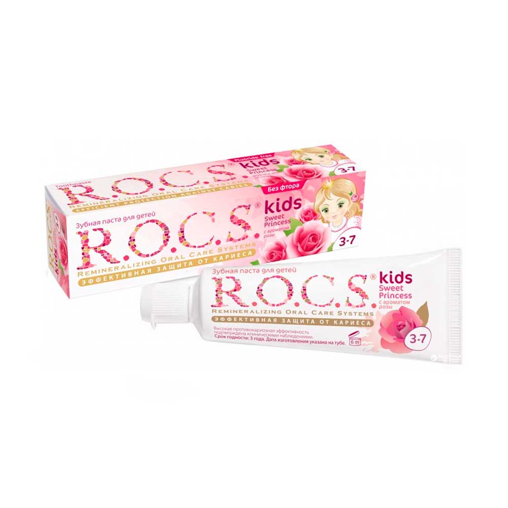 Зубная паста R.O.C.S. Kids Sweet Princess с ароматом розы является эффективным средством защиты от кариеса для детей от 3 до 7 лет, не содержащим фтор. Разработана при участии стоматологов с учетом возрастных особенностей ребенка. Стоматологи особо рекомендуют использовать зубную пасту без фтора в случаях, когда имеется риск избыточного поступления фтора в организм. Если у ребенка уже есть видимые признаки флюороза. Если в питьевой воде содержится избыточное количество фтора (более 1.2 мг/л). Если ребенку назначены препараты содержащие фтор. Низкоабразивная формула не травмирует ткани зубов (RDA=45). Для чистки зубов рекомендуется использовать небольшое количество пасты размером с горошину. Дети дошкольного возраста должны чистить зубы под контролем взрослых. Не содержит лаурилсульфат натрия и фтор. Зубная паста может быть рекомендована детям склонным к аллергии.
