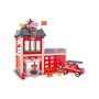 Эта трехуровневая деревянная пожарная часть готова к любой чрезвычайной ситуации, с меблированным офисом, столовой и спальней, рабочей дверью гаража и пожарным столбом, который проходит сверху вниз.