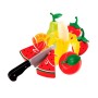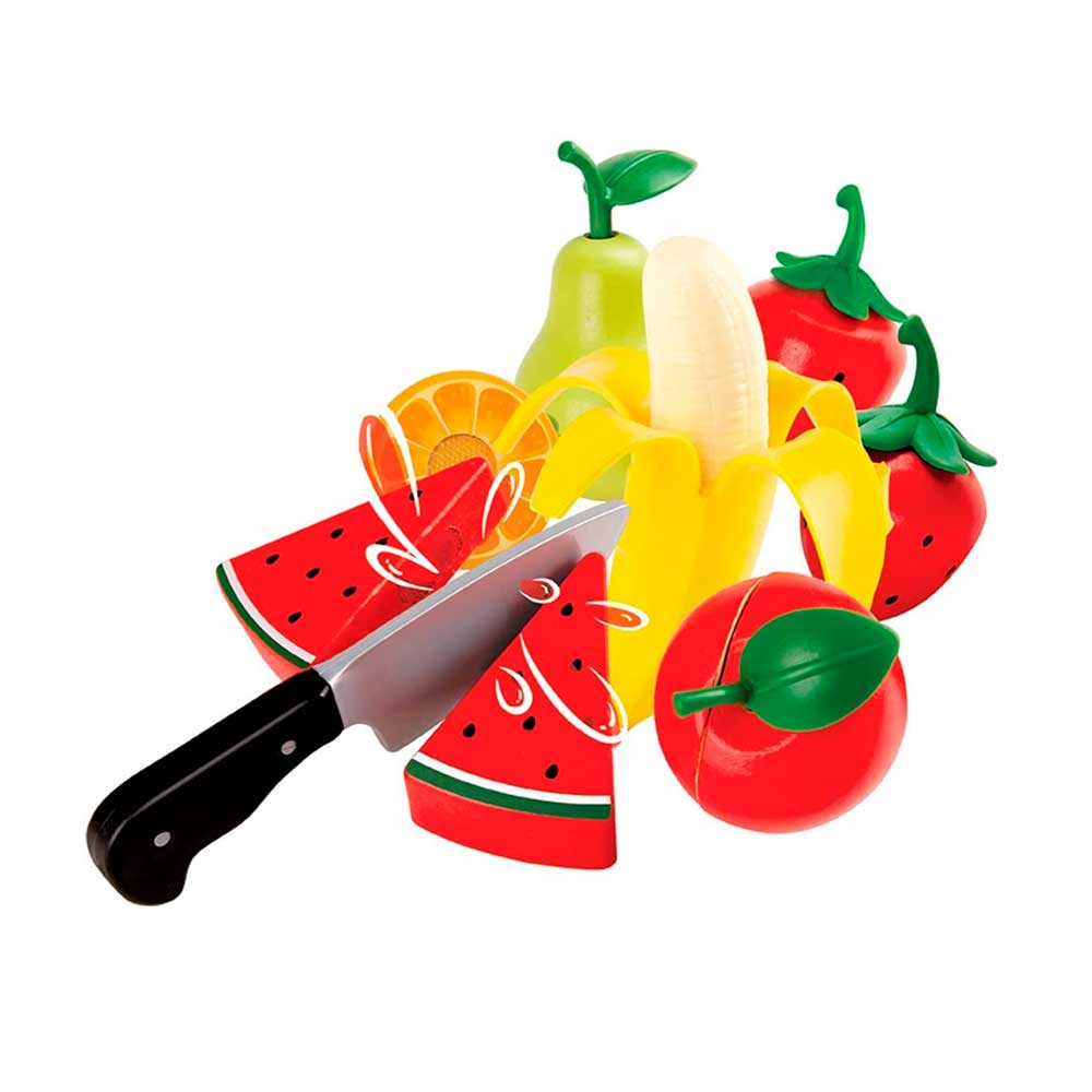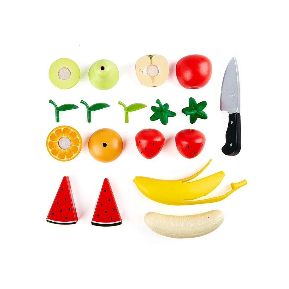 Привыкайте к здоровой пище с этим милым фруктовым набором. Включает в себя один реалистичный игровой нож, две клубники, одну грушу, один апельсин, одно яблоко со съемными стеблями и один ломтик арбуза, которые можно нарезать с помощью реалистичного игрового ножа, и один банан, который можно очистить.