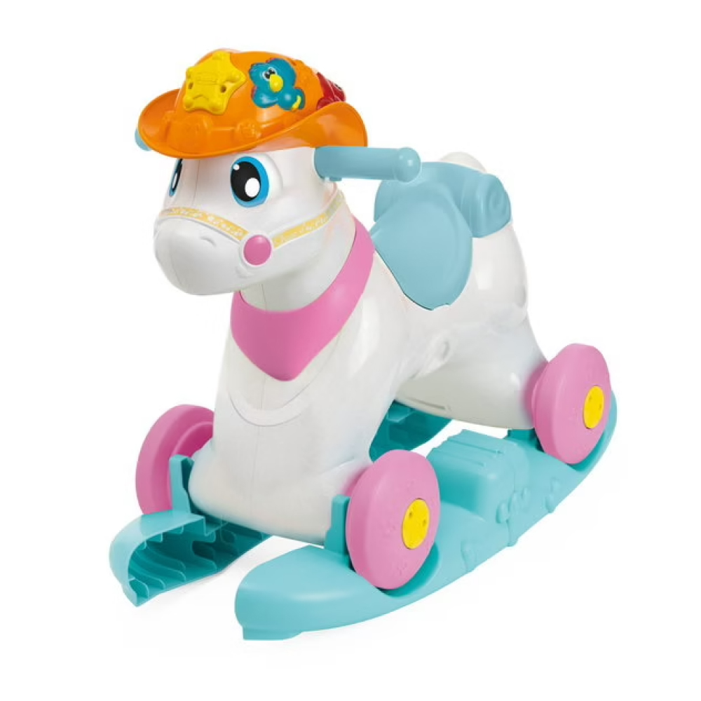 Новая лошадка-качалка Baby Rodeo предназначена для деток с 12 месяцев. Когда ребенок кормит лошадку, она издает ржание. Как же здорово и приятно с ней обниматься! Посмотри на ее мордочку: она так счастлива! Когда малыш гладит лошадку, она двигает глазками и весело ржет. 3 режима игры: — Качалка. С практичной съемной базой. Теперь можно качаться в полной безопасности! — Едем верхом на лошадке. Достаточно снять базу, и малыш может свободно передвигаться на лошадке по дому и играть в безопасности! — Электронный игровой центр. 2 кнопки на корпусе игрушки активируют световые и звуковые эффекты. Благодаря интерактивным датчикам лошадка как живая!