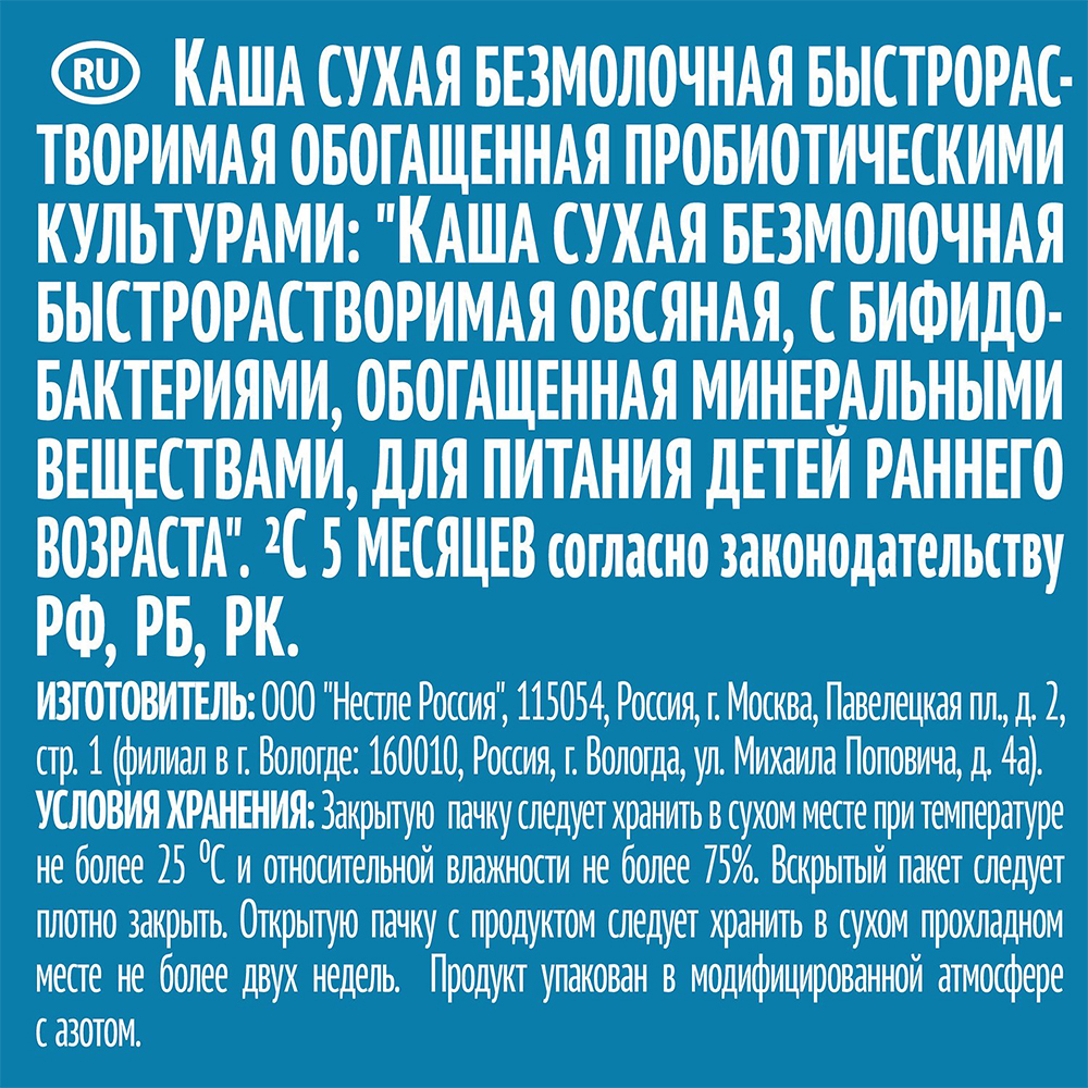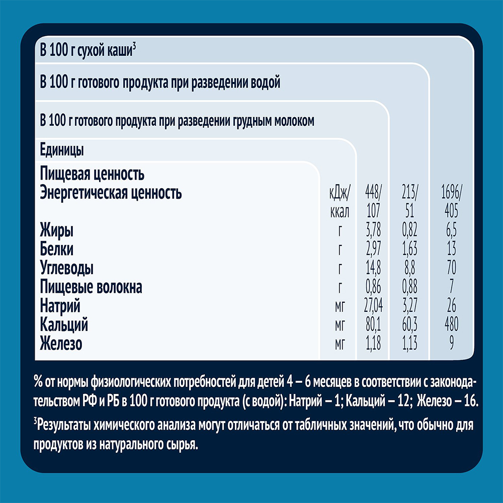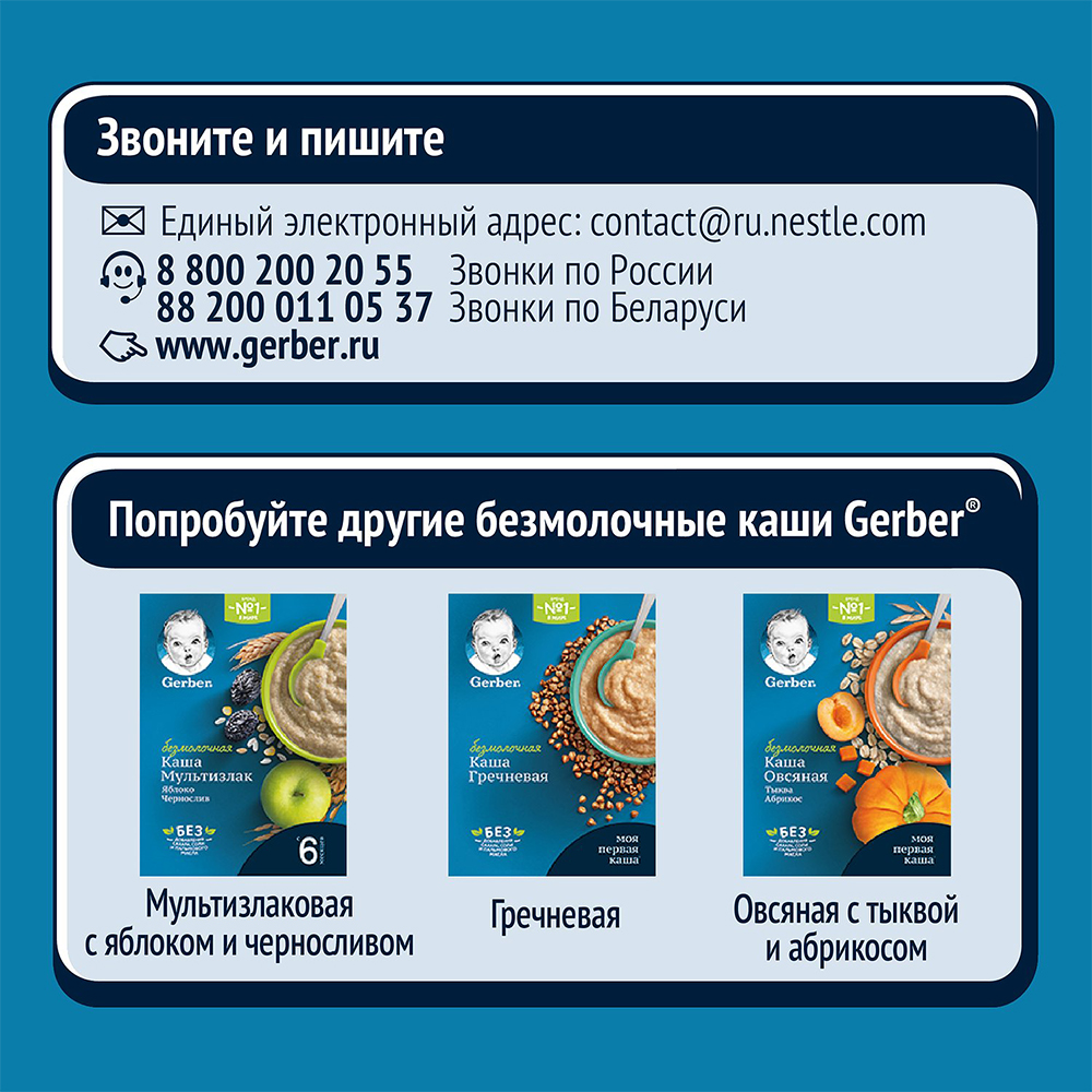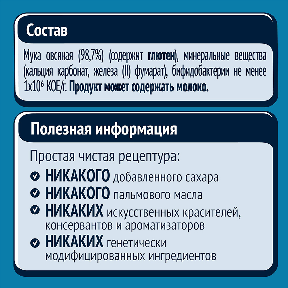 Gerber знает, что введение прикорма — особенное событие для вас и вашего малыша. Вы хотите, чтобы ваш малыш пробовал только лучшее. И мы тоже! Именно поэтому каши Gerber содержат только специально отобранные ингредиенты и ничего лишнего. Мы выстраиваем долгосрочные партнерские отношения с фермерами и поставщиками сырья, чтобы обеспечить максимально высокое качество фруктов и злаков. Мы добавляем в каши Gerber железо, так как этот элемент необходим для профилактики железодефицита и для полноценного физического и умственного развития. rnКаши Gerber имеют простую чистую рецептуру: rn• Без добавления сахара rn• Без пальмового масла rn• Без красителей, консервантов и ароматизаторов rn• Без генетически модифицированных ингредиентов rnСостав: мука овсяная (98,7 %) (содержит глютен), минеральные вещества (кальция карбонат, железа(II) фумарат), бифидобактерии не менее 1х106 КОЕ/г.
