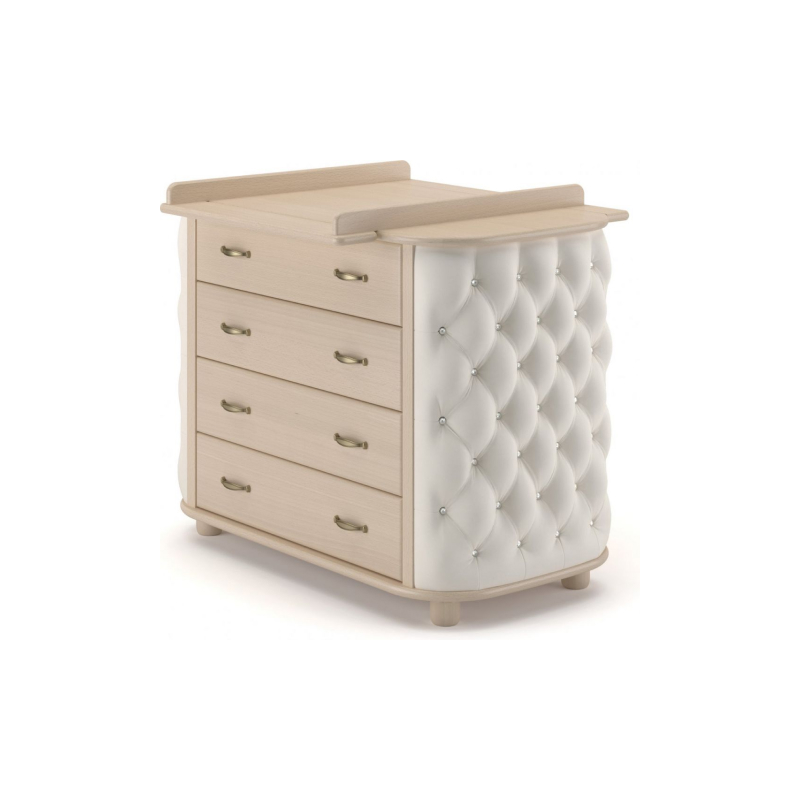 Детский комод Гандылян Тиффани — комод для хранения детских вещей, украшенный мягкой обивкой. Такой комод не только поможет маме удобно хранить вещи ребенка, но и украсит любую детскую комнату. На комоде расположен съeмный пеленальный столик, который поможет ухаживать и переодевать малыша на удобной для родителей высоте. Сбоку расположена дополнительная полочка.