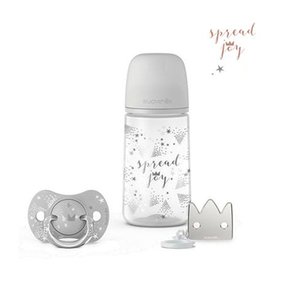 Набор Suavinex Joy бутылочка 270 мл пустышка 0-6м зажим для пустышки серый
