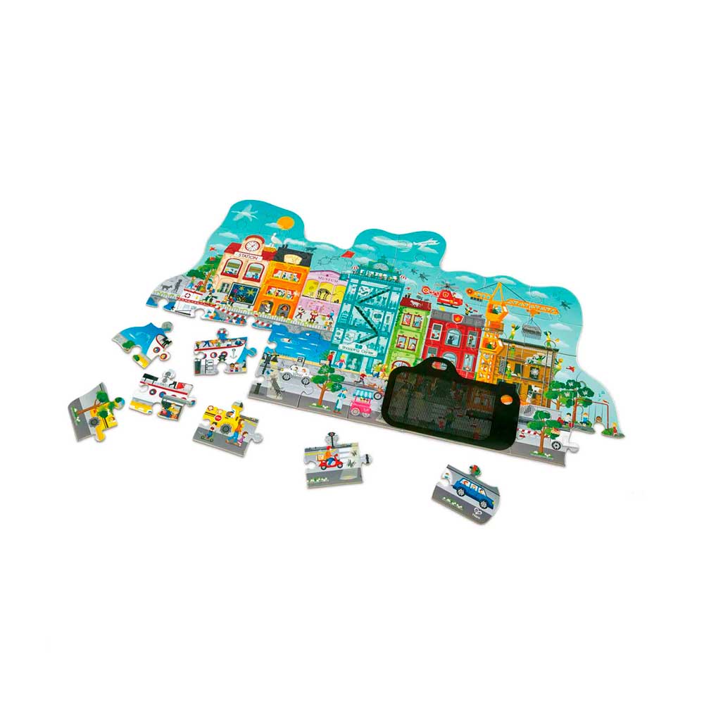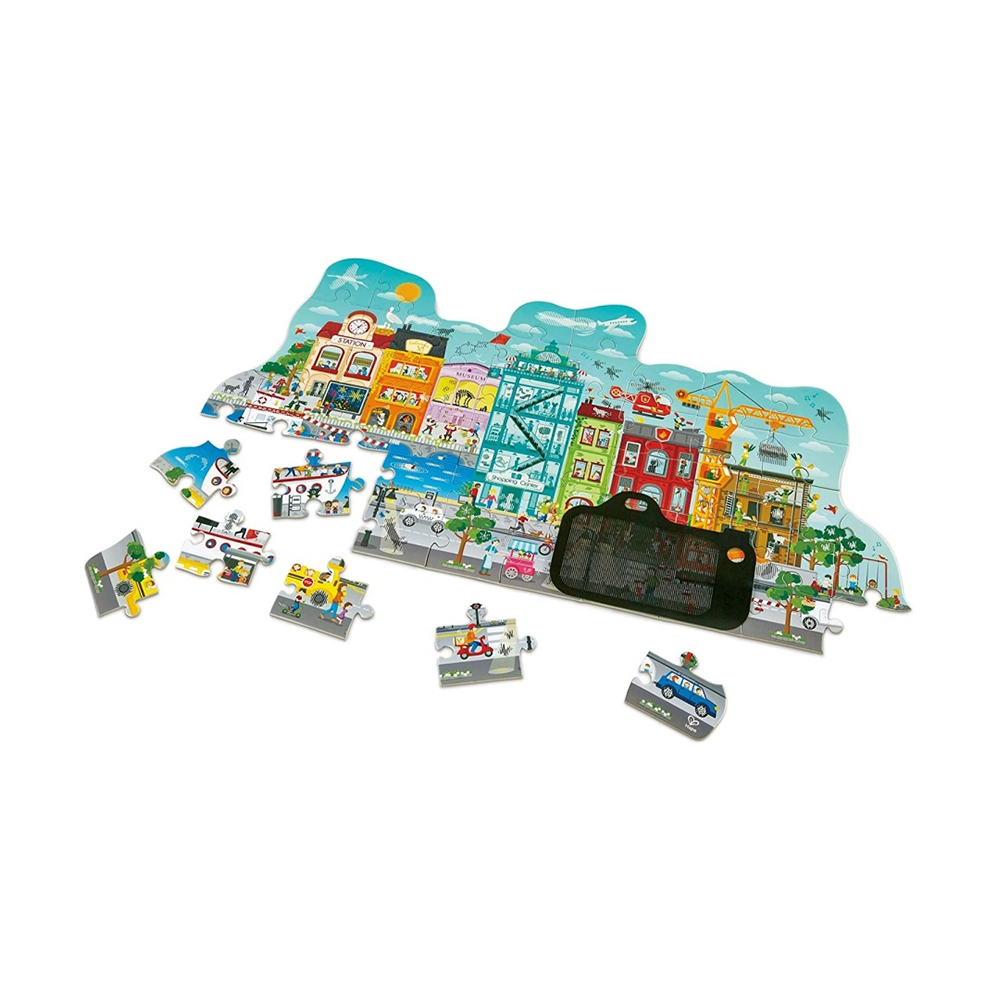 Большая городская головоломка из 49 элементов с волшебным карточным зрителем, который создает анимированные эффекты, когда вы перемещаете его по картинке.