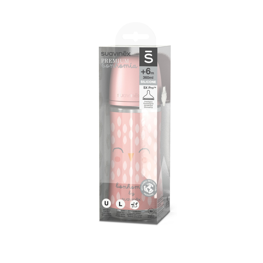 Бутылочка Suavinex премиум-класса с физиологической соской SX Pro из коллекции Bonhomia Premium. Она разработана с учетом орального развития вашего ребенка. Отверстие в соске пропускает небольшое количество жидкости. Идеально подходит для первых дней жизни новорожденного.