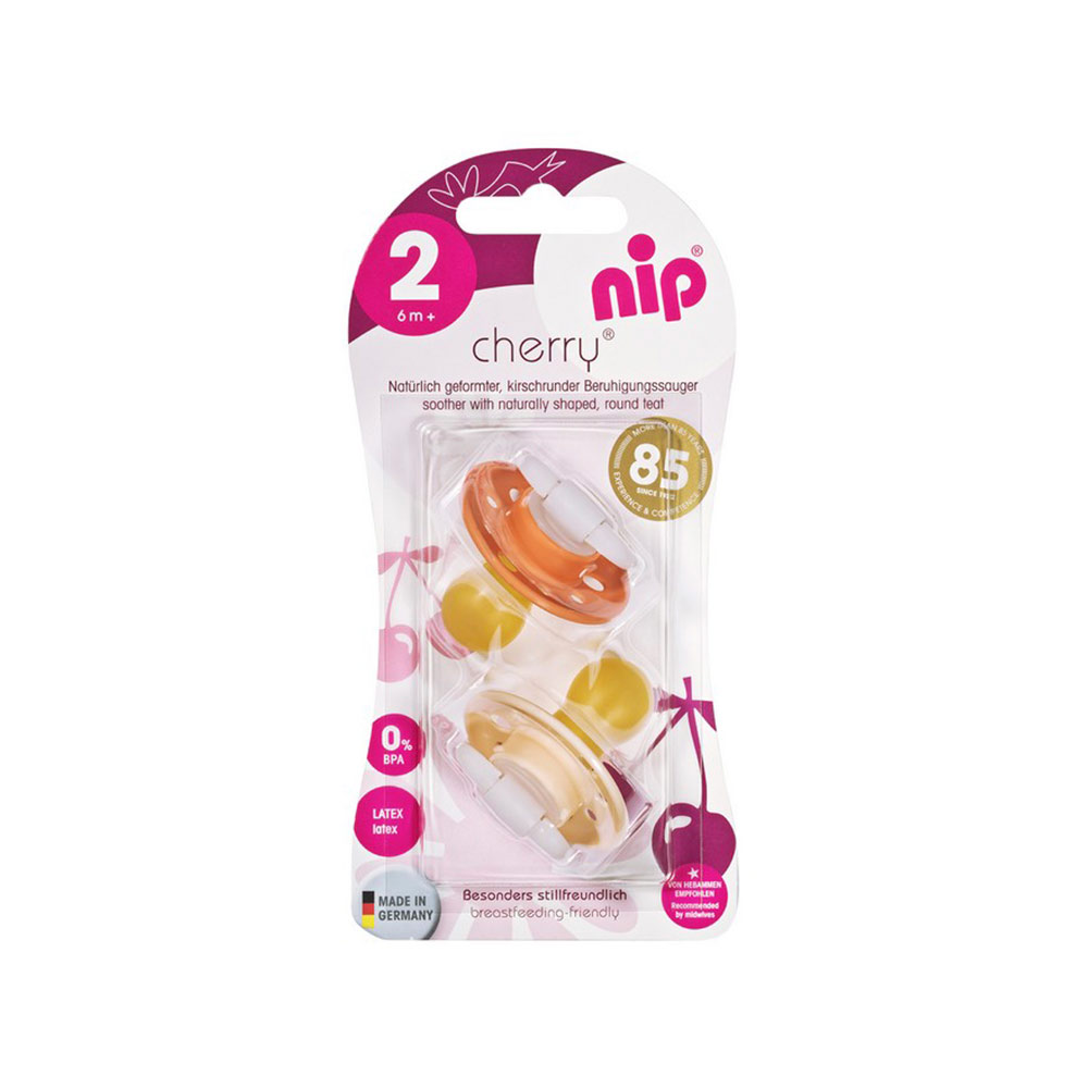 Пустышка с ортодонтической соской NIP Вишенка из латекса помогает полости рта и языку правильно развиваться, а ребенку – удовлетворять свой сосательный рефлекс.