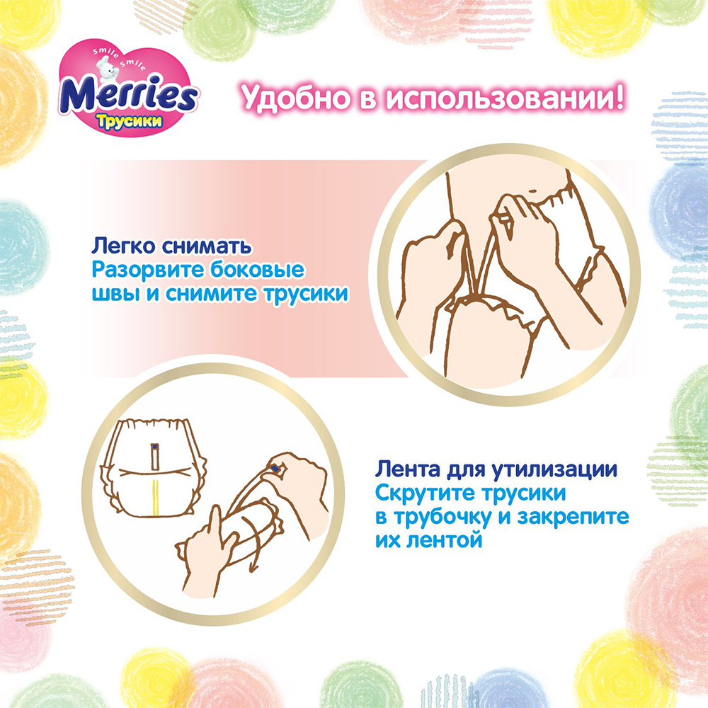 Трусики-подгузники Merries идеально подойдут малышу, который начинает активно двигаться. Даже если малыш очень активный, надежно защищают от протеканий и опрелостей, обеспечивая необходимый комфорт и свободу движений!rnКрой трусиков Merries разработан с учетом анатомических особенностей малыша:rn• Хорошо сидят на талии и не сползают, но при этом не жмут и не оставляют следов на нежной коже малышаrn• Отлично облегают попку, сохраняют форму и заботятся о комфорте малыша, даже когда трусики уже наполненыrn• Комфортно садятся в паховой области и не создают дискомфорта между ножекrn• Нежно облегают ножки, не образуют щелей и защищая от протекания